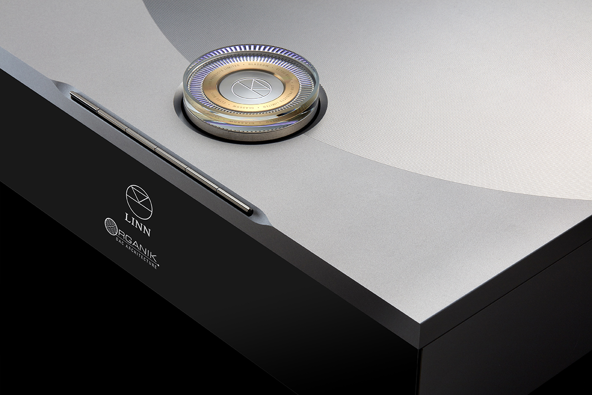 スリットからLEDの光が漏れる様子はジェットエンジンをイメージしており、Linn ロゴ周りのゴールドに見えるリング状の部分は、ダイヤルのベアリング機構(ハウジング:真鍮製)そのもので、出自を表すワードである 「LINN PRODUCTS」 「GLASGOW」「CLYDE BUILT」 の3つが印字されています。